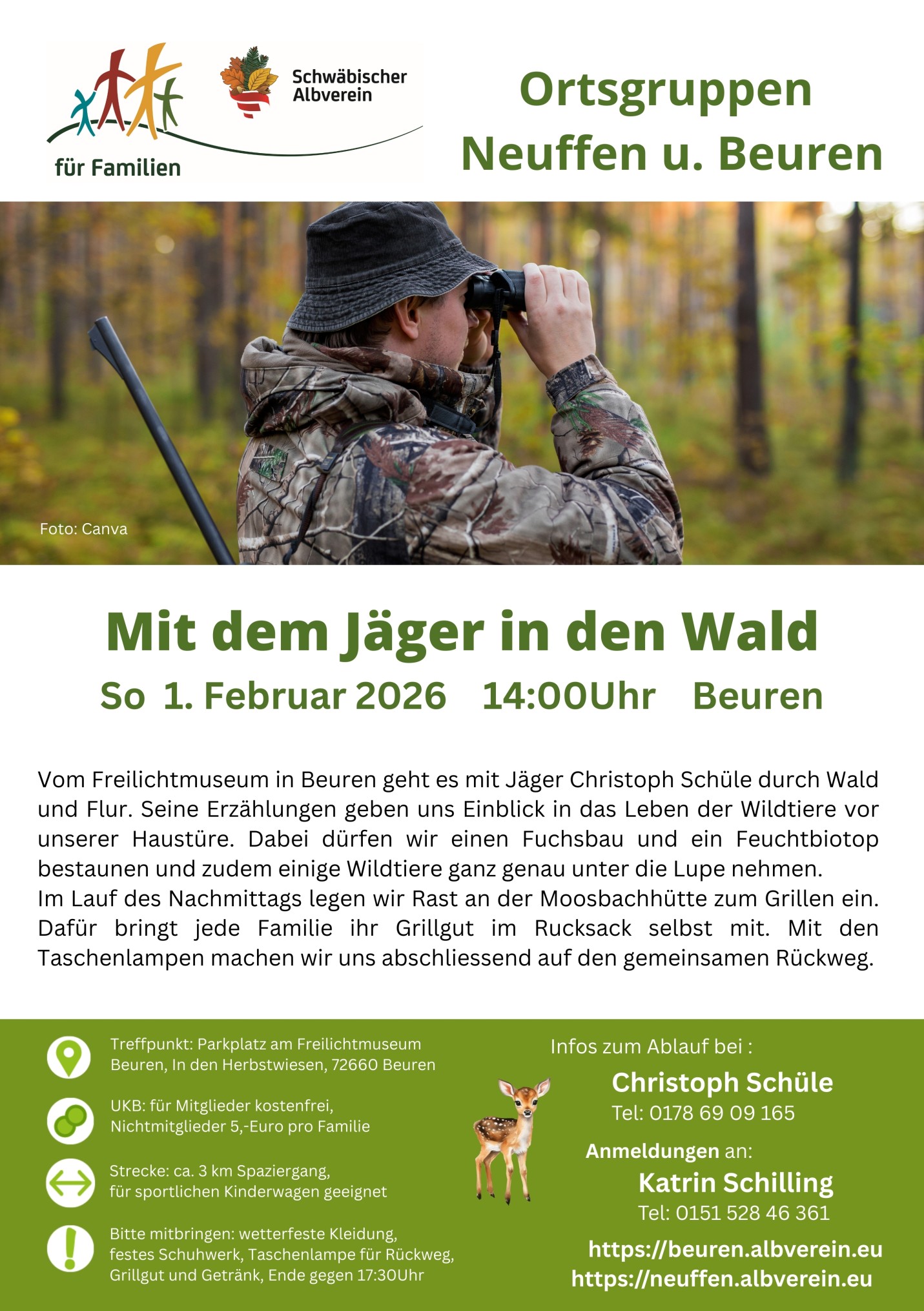 Mit dem Jäger in den Wald So., 01.02.2026, Wir freuen uns auf Euch! Katrin Schilling und Christoph Schüle Uhrzeit: 00:00 iCalendar Mit dem Laden der Karte akzeptieren Sie die Datenschutzerklärung von Google.Mehr erfahren Karte laden Google Maps immer entsperren zur Übersicht
